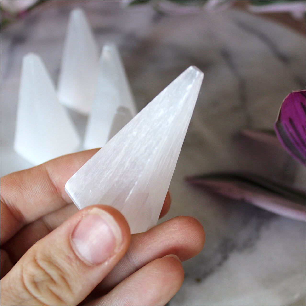Please note, stones are natural and WILL vary in precise size & shape, and may not exactly match photo. Selenite is a very soft stone that easily scratches, flakes, and chips. Please be careful when handling and avoid getting wet.